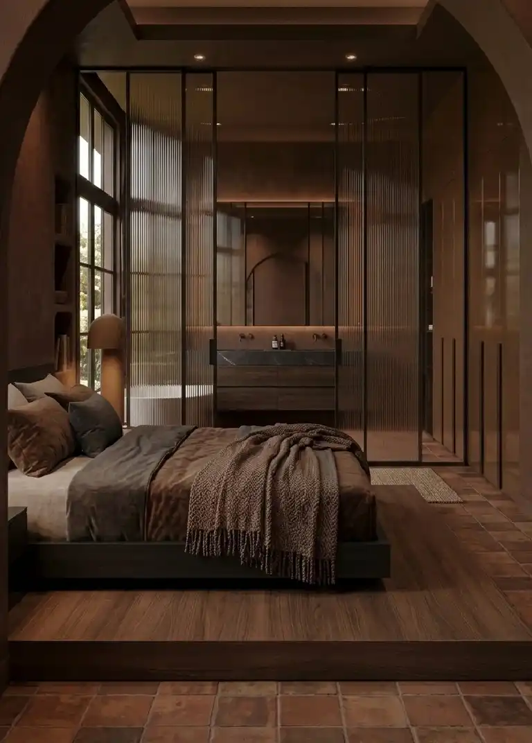 Brown Bedroom with Ribbed Glass Partitions and Dark Walnut Millwork