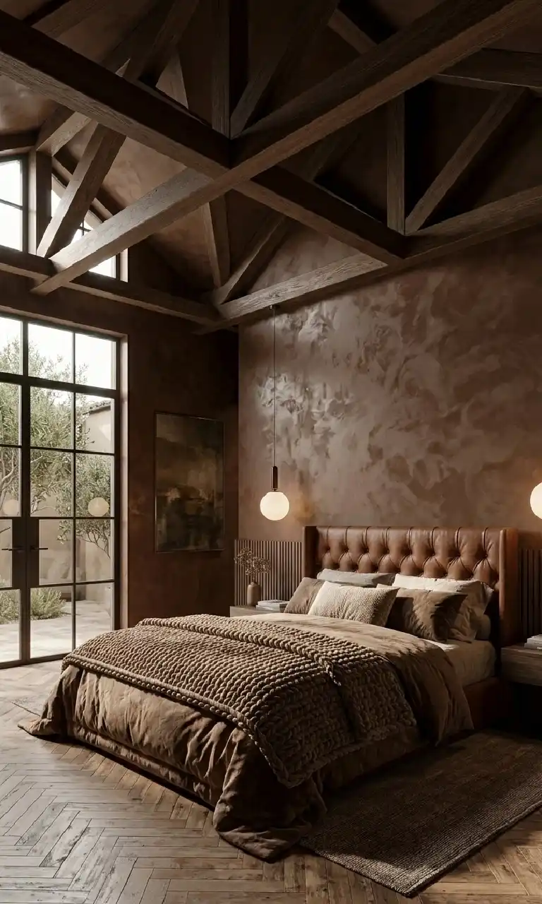 Brown Bedroom with Venetian Plaster Finish and Oak Timber Rafters