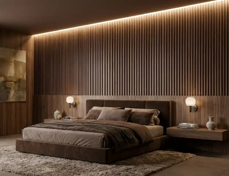 Brown Bedroom with Vertical Fluted Wood Paneling and Recessed Cove Lighting