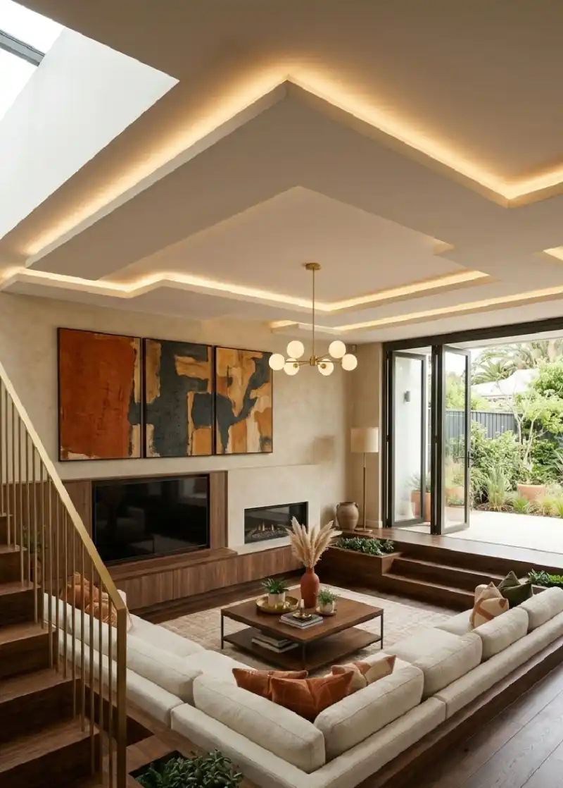 . Cantilevered Ceilings in a Family Room Idea Featuring Earth-Tone Textures