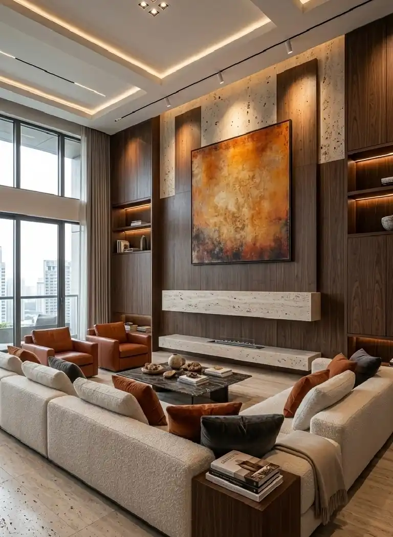 Family Room Idea with Cantilevered Stone Hearth and Double-Height Glazing