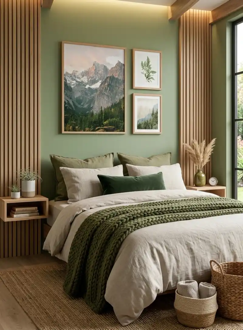 Green Bedroom : Biophilic Sage Wall with Timber Integration