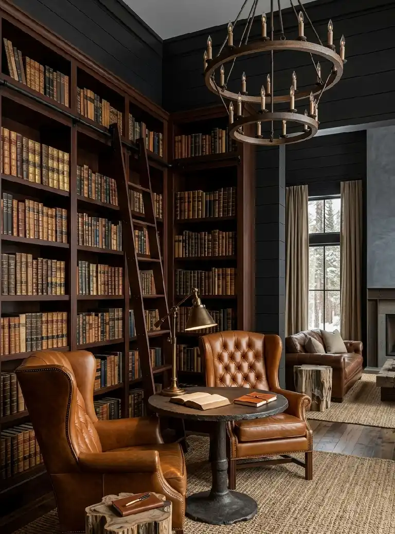Rustic Living Room Idea: Corner Library Nook with Leather Recliners and Wood Built-ins