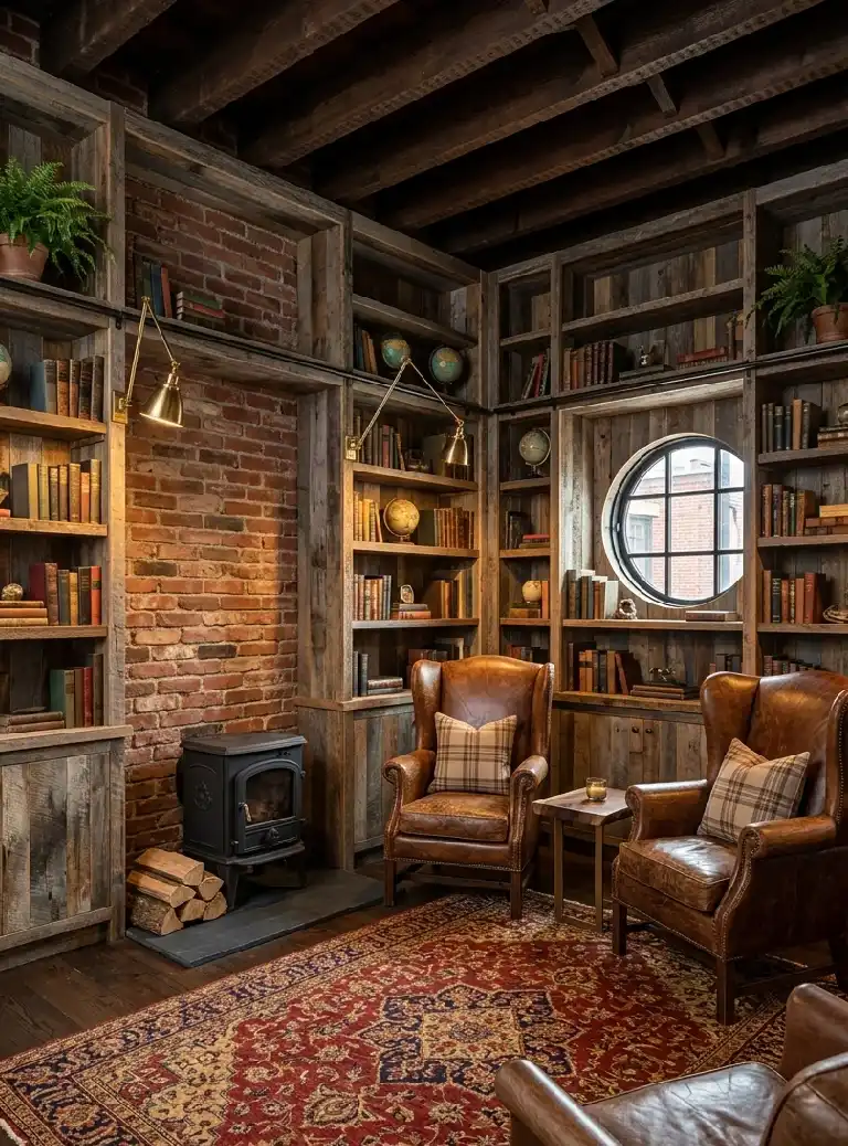 Rustic Living Room Idea: Library Nook with Reclaimed Wood Cabinetry