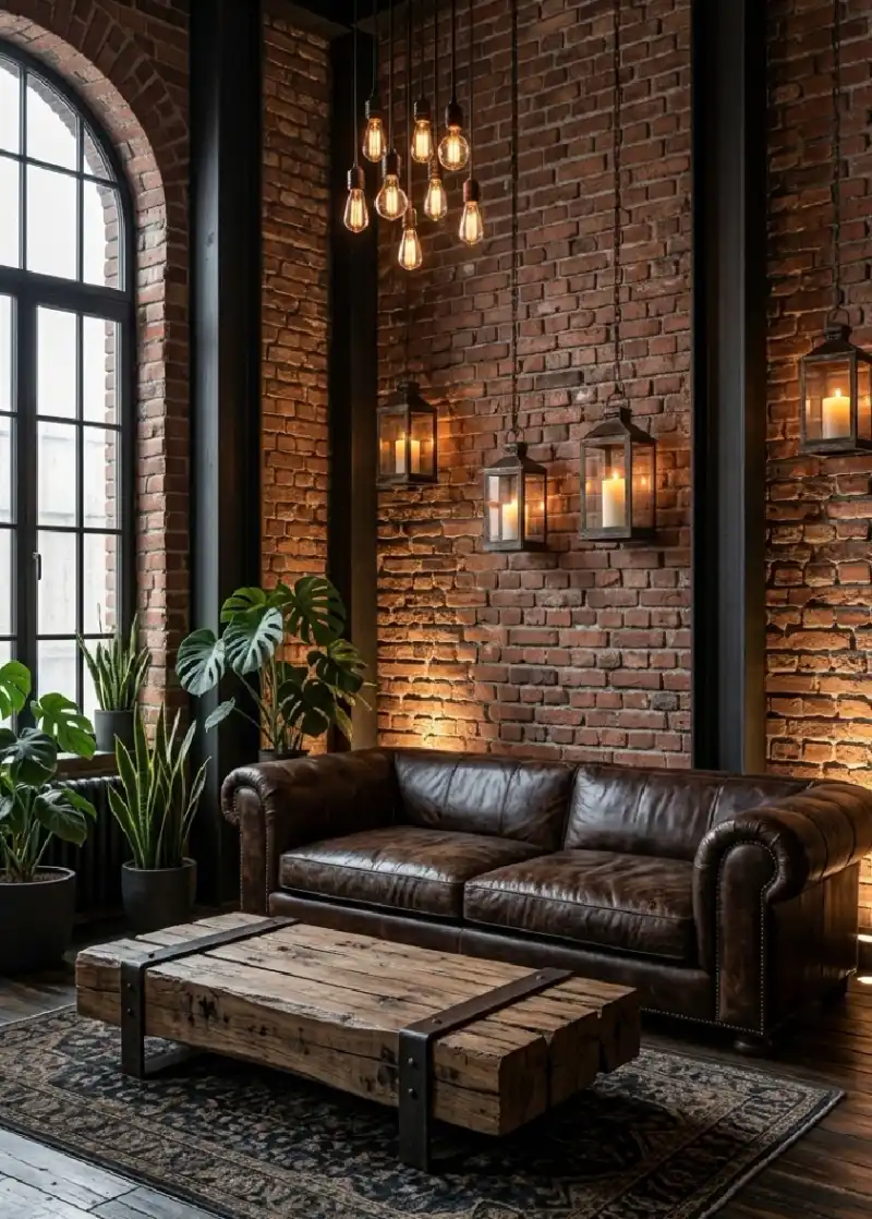 Rustic Living Room Idea: Masonry Textures and Oversized Leather Seating