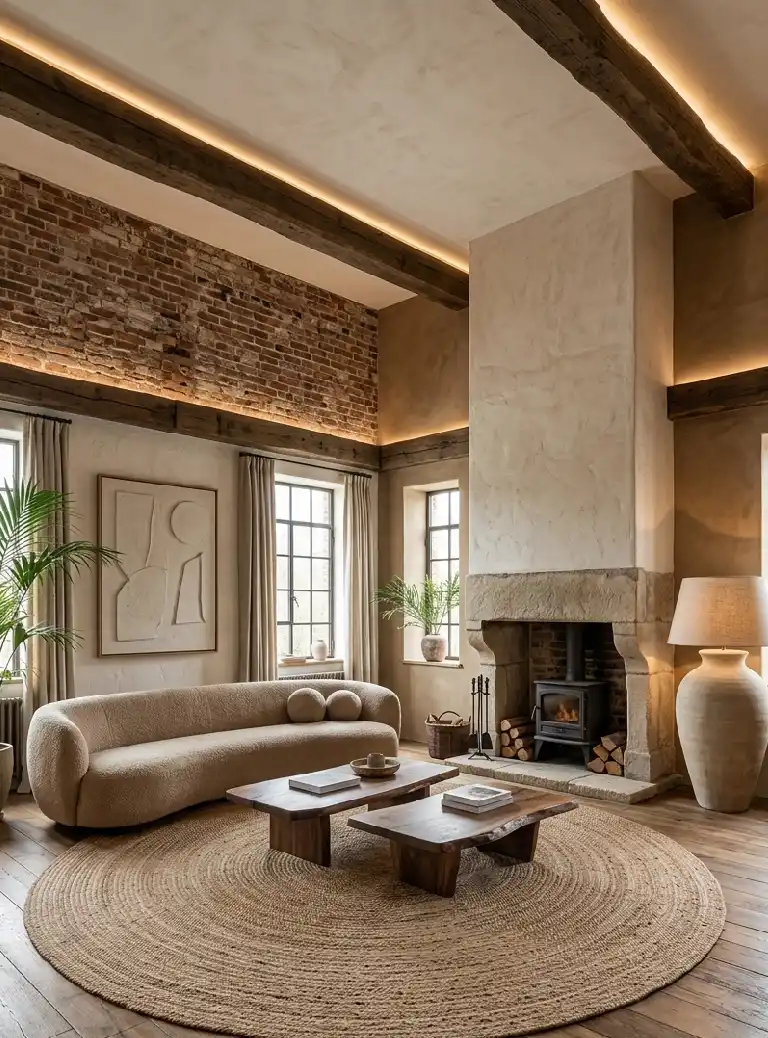 Rustic Living Room Idea: Textured Monochromatism and Plaster Finishes