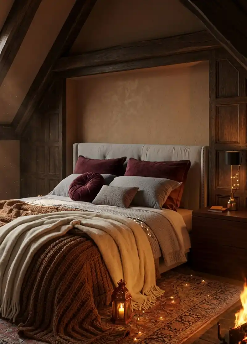 A cozy, moody attic bedroom with sloped ceilings and dark wo...