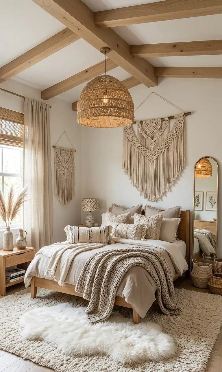 Architectural Layering and Boho Chic Bedroom Ideas with Macramé Wall Art