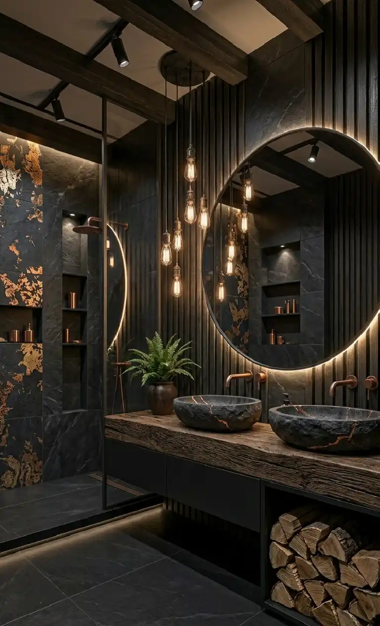Architectural Noir: Luxury Dark Bathroom Idea with Copper Accents