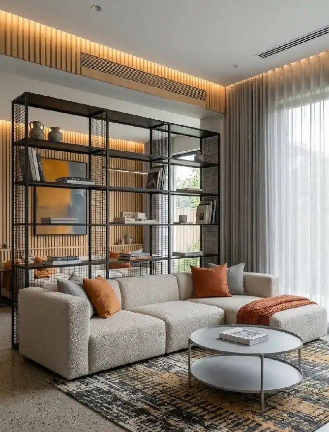 Asymmetric Small Minimalist Living Room with Industrial Steel and Earthy Textiles