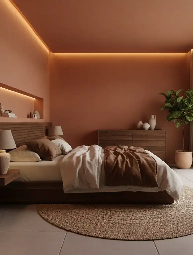 This space focuses on warm, clay-like tones where the walls ...