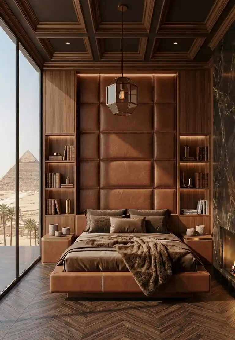 Brown Bedroom Suite with Coffered Ceilings and Inset Leather Panels