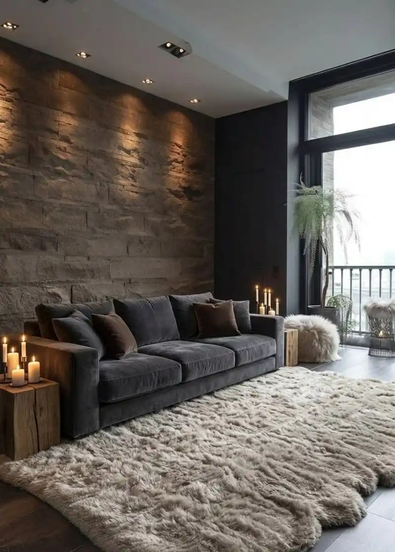 A living room featuring a massive textured stone accent wall...