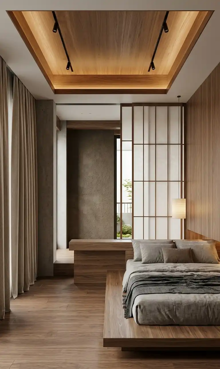 Cantilevered Oak Elements and Japandi Bedroom Idea with Shoji-Inspired Partitioning