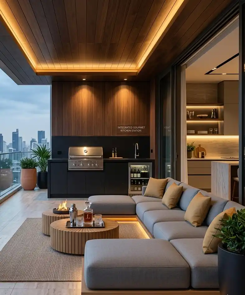 Cantilevered Slab Design: A Luxury Modern Balcony Idea with Integrated Outdoor Kitchen