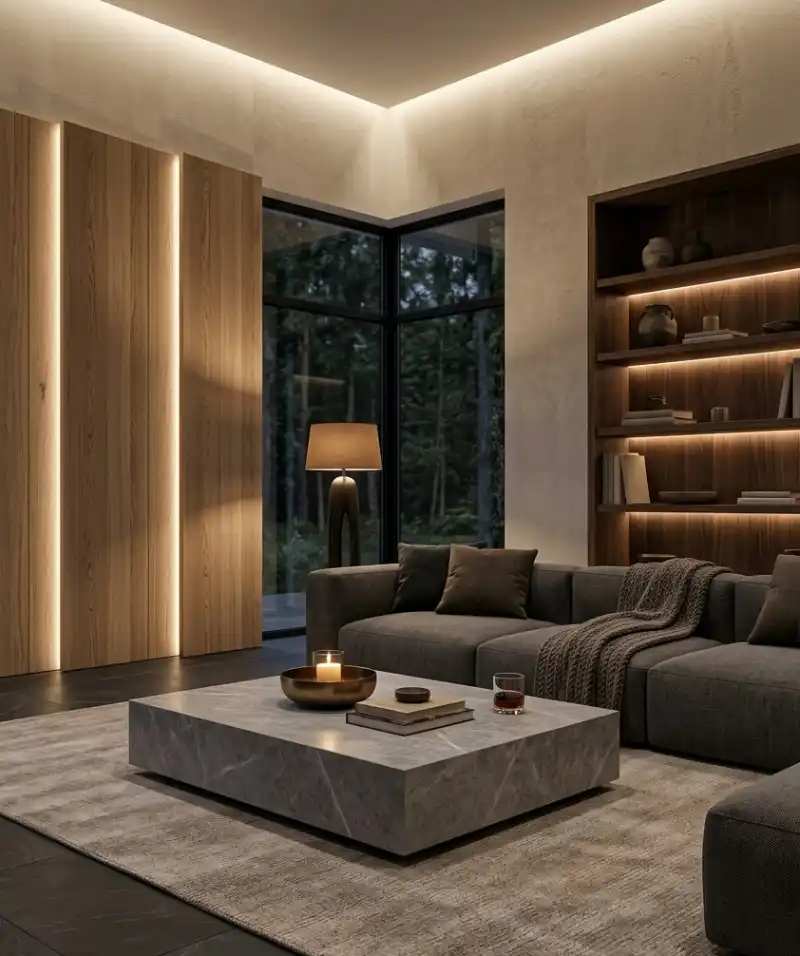 Cantilevered Stone and Charcoal Textures: A Rustic Living Room Idea