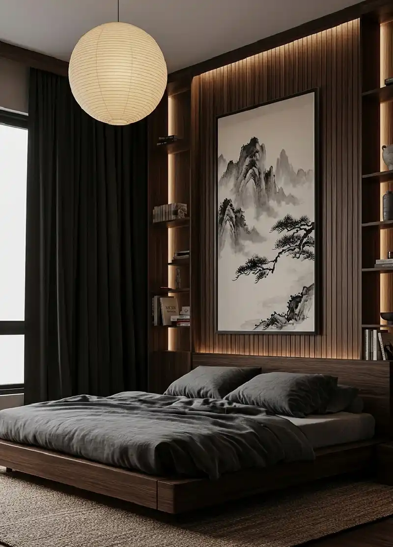 Cinematic Wide-Angle Capture of a Japandi Bedroom Idea Combining Dark Walnut Millwork and Traditional Artwork