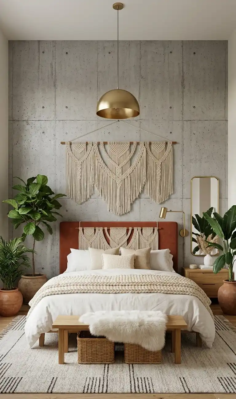 Concrete Brutalism and Textile Softening in Boho Chic Bedroom Ideas
