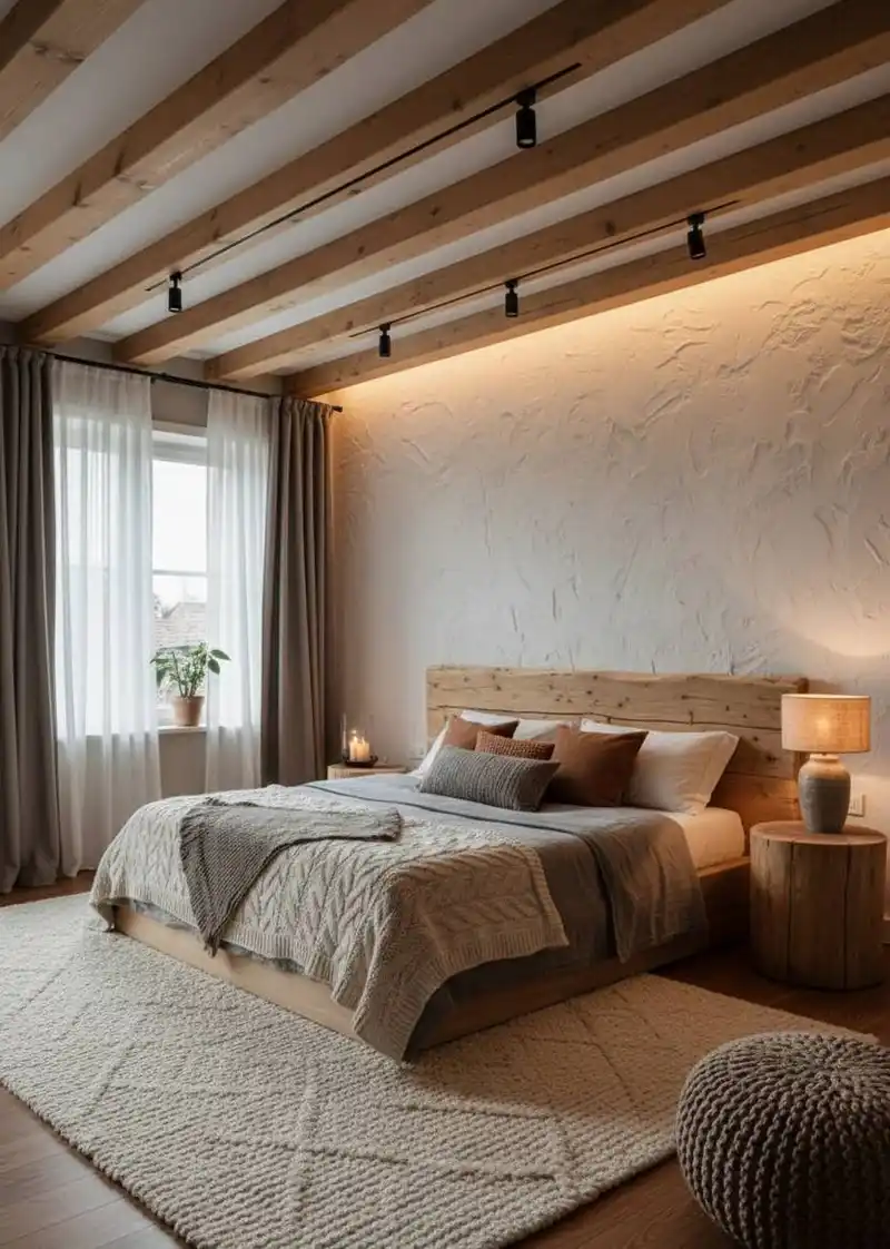 This bedroom design celebrates organic textures and raw mate...