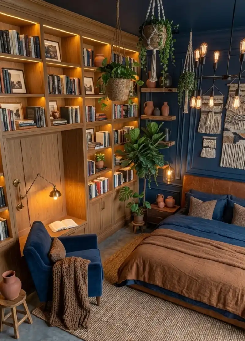 Cozy Brown and Navy Blue Bedroom Design: Reading Nook Integration and Layered Lighting