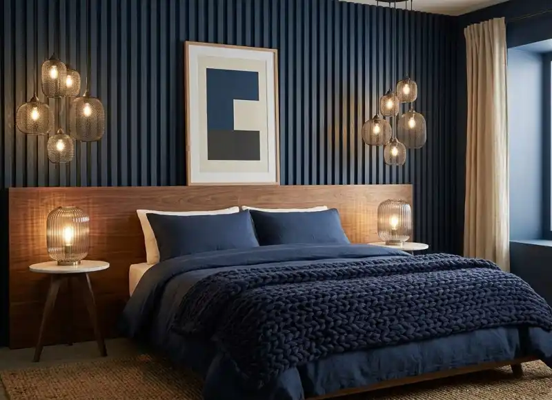 Cozy Navy Blue and Brown Bedroom: Contemporary Linear Design and Artisan Finishes