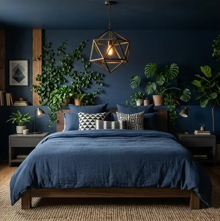 Cozy Navy Blue and Brown Bedroom: Minimalist Low-Profile Geometry