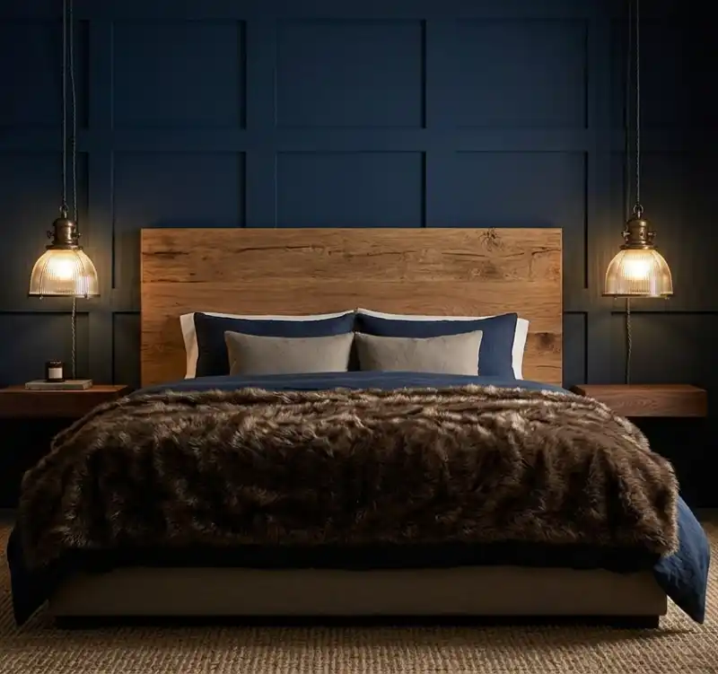 Cozy Navy Blue and Brown Bedroom: Rustic Industrial Integration and Mood Lighting