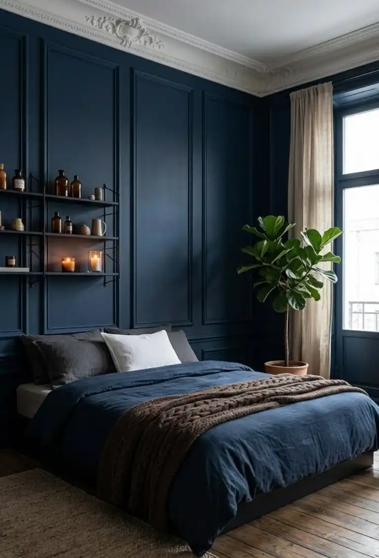 Cozy Navy Blue and Brown Bedroom with Deep Navy Paneling and Classic Crown Molding