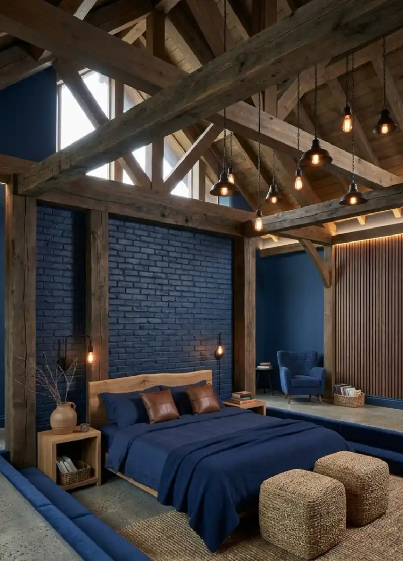 Cozy Navy Blue Bedroom Design: Industrial Chic with Exposed Brick and Dark Timber