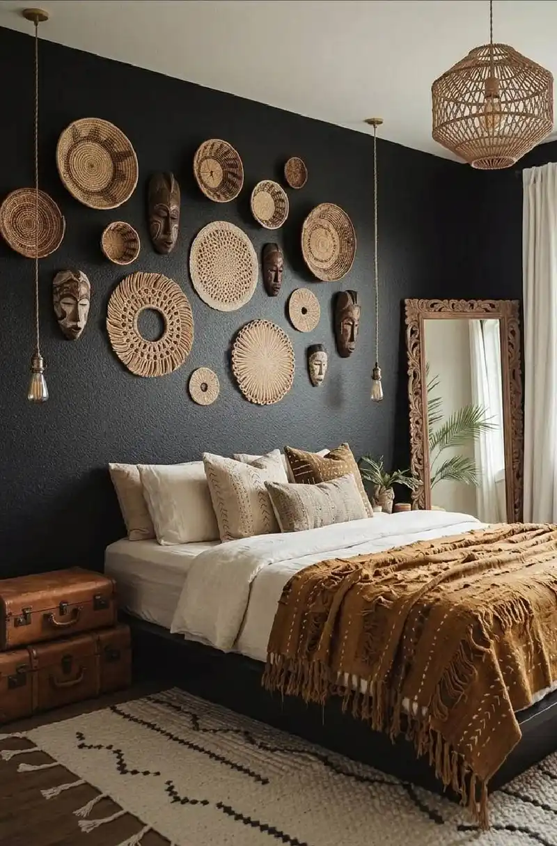 Curated Artifacts & Charcoal Contrast bedroom
