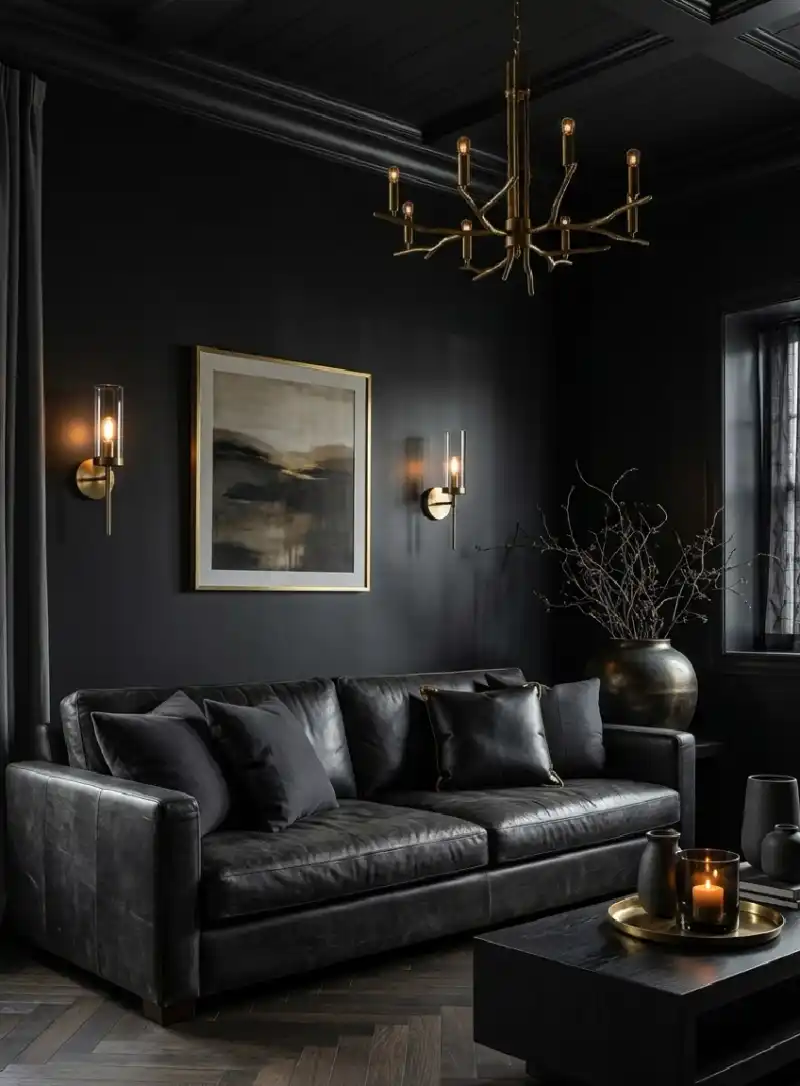 Dark Living Room design : Obsidian Walls with Metallic Brass Accents and Tactile Leather