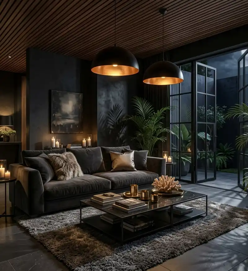Dark Living Room Idea: Biophilic Shadows and Tropical Hardwoods