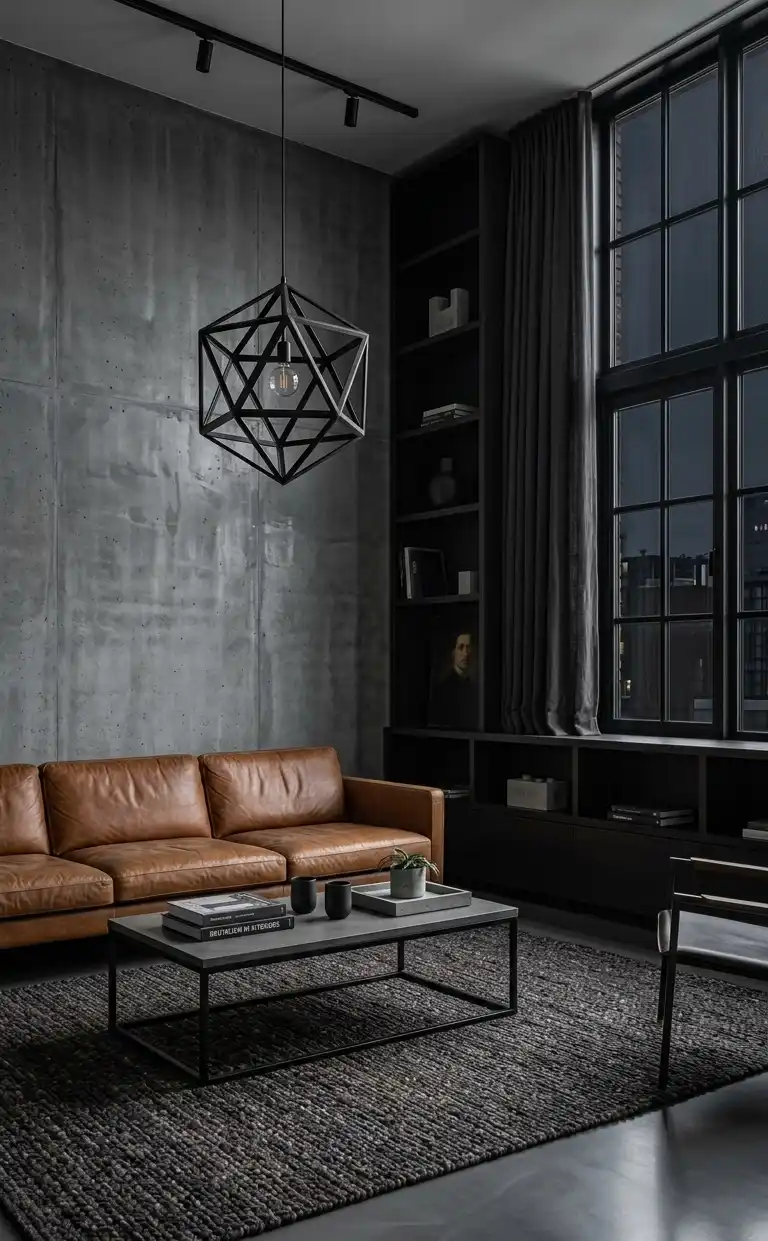 Dark Living Room Idea: Industrial Brutalism with Cognac Leather Accents