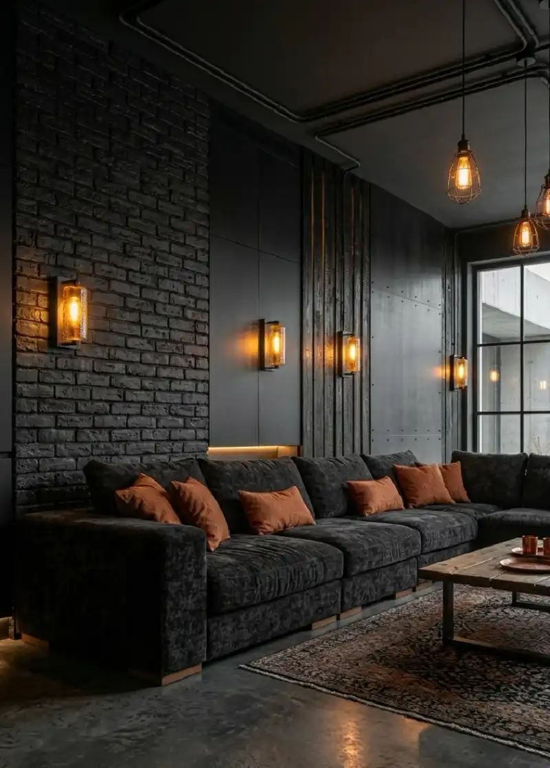 Focusing on the "New Industrial" style, this Dark Living Roo...
