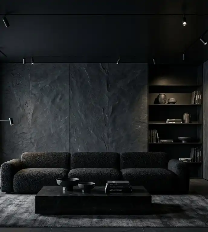 Dark Living Room Idea: Midnight Slate Walls and High-Contrast Architectural Lighting