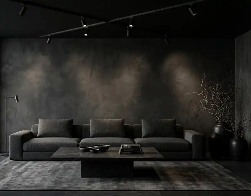 Dark Living Room Idea: Monochromatic Obsidian Plaster and Industrial Rail Lighting
