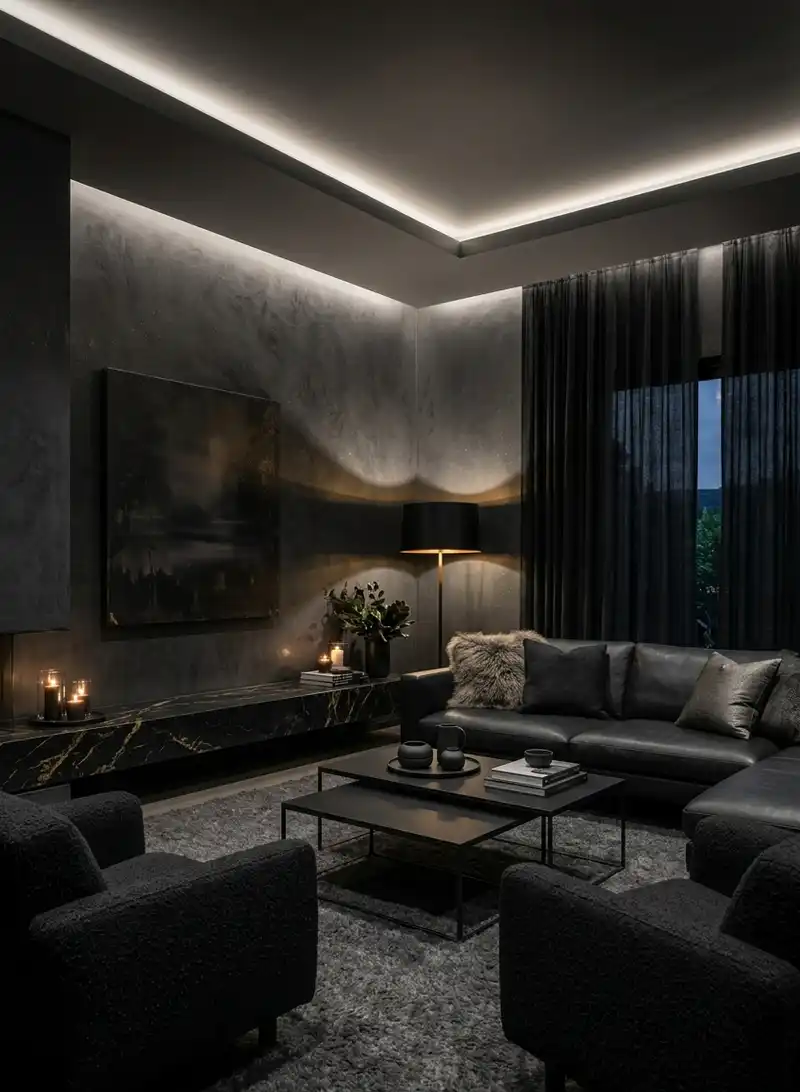 Dark Living Room Idea: Monochromatic Texture Play in Carbon