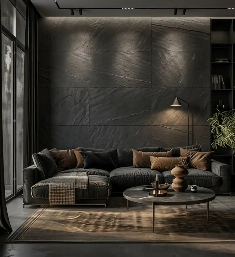 Dark Living Room Idea : Monolithic Charcoal Slate and Raw Silk Accents