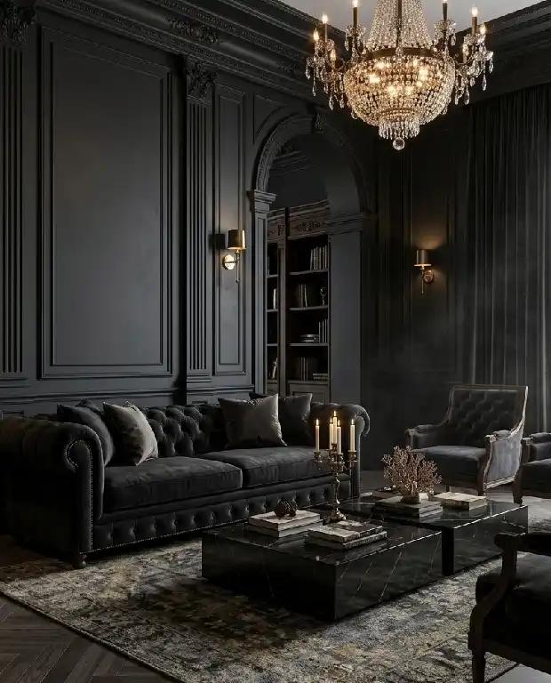 Dark Living Room Idea: Neo-Classical Noir with Velvet Textures