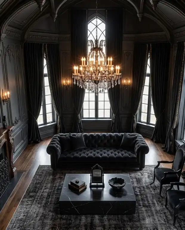 Dark Living Room Idea: Neo-Gothic Velvet Textures with Ornate Moldings
