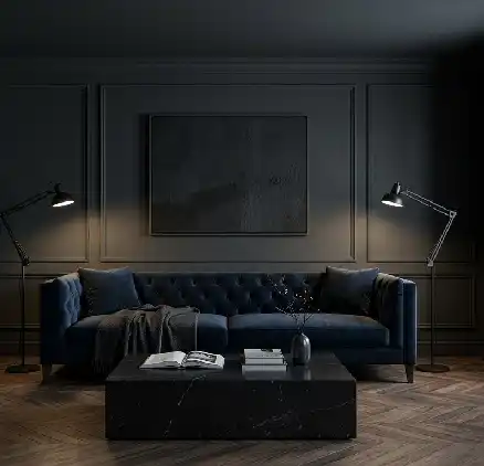 Dark Living Room Idea: Tactile Contrast in Velvet and Charcoal Paneling