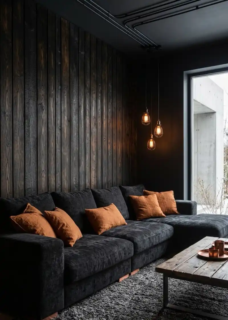 Dark Living Room Ideas 2026: Vertical Shou Sugi Ban & Matte Charcoal Textile Integration