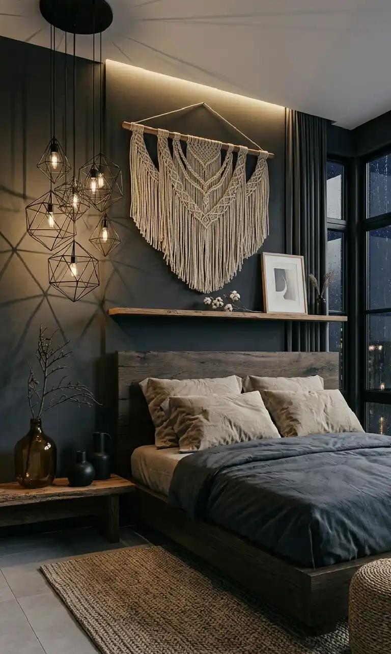 Dark Mode Japandi with Woven Natural Fibers Grey Bedroom Idea