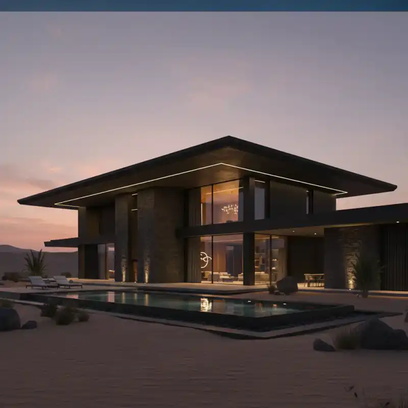 A stunning dark villa emerges from the desert, offering a lu...