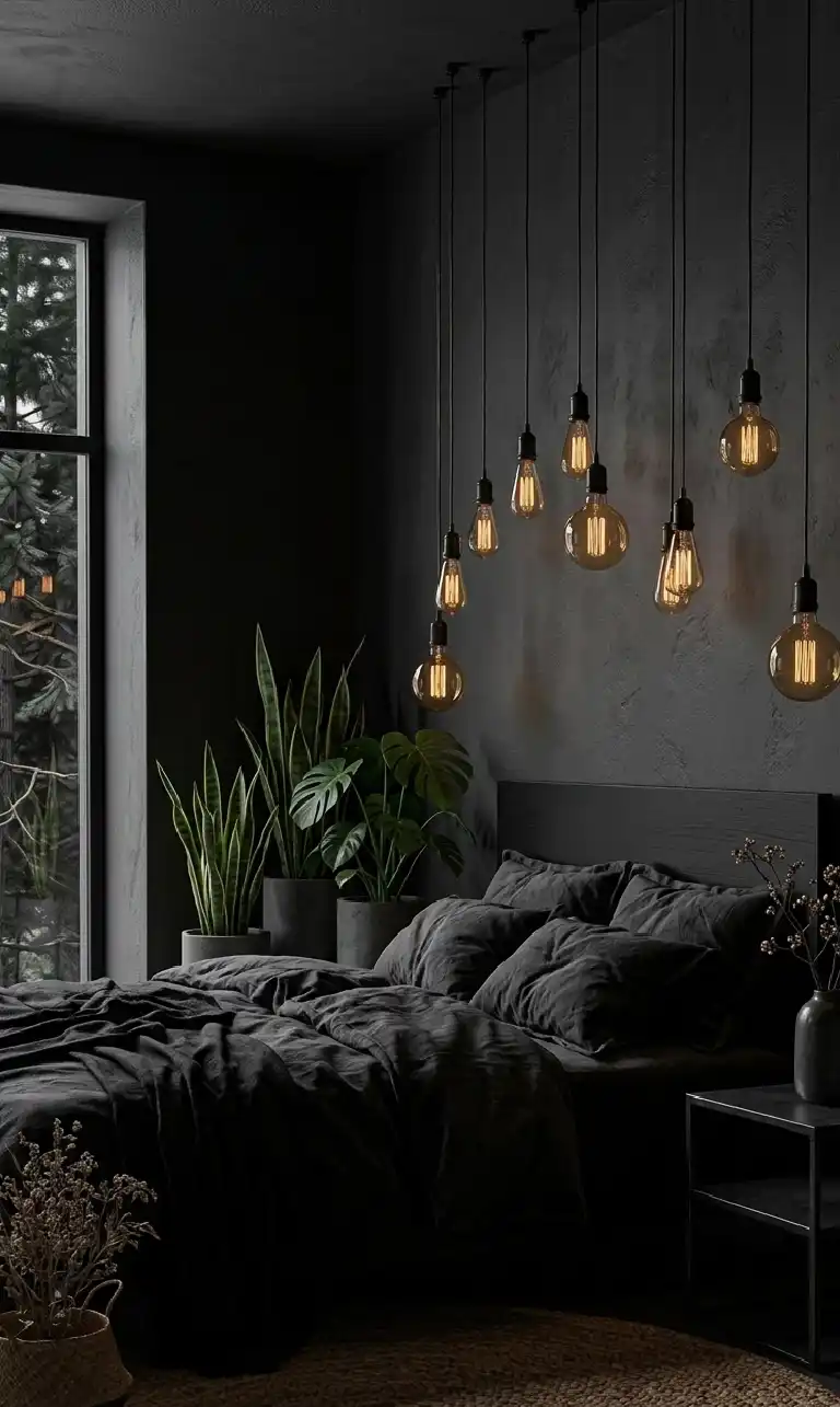 Dark Moody Bedroom: Biophilic Contrast within a Matte Obsidian Shell
