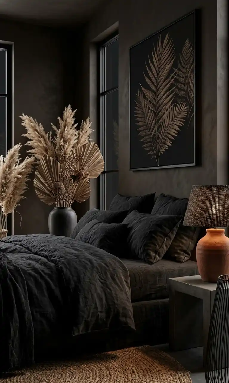 Dark Moody Bedroom: Earthy Noir with Terracotta and Fiber Accents