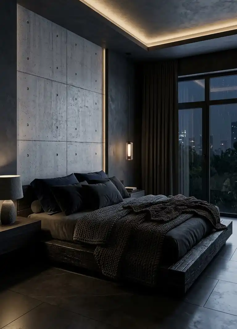 Dark Moody Bedroom featuring Raw Concrete and Textured Plaster