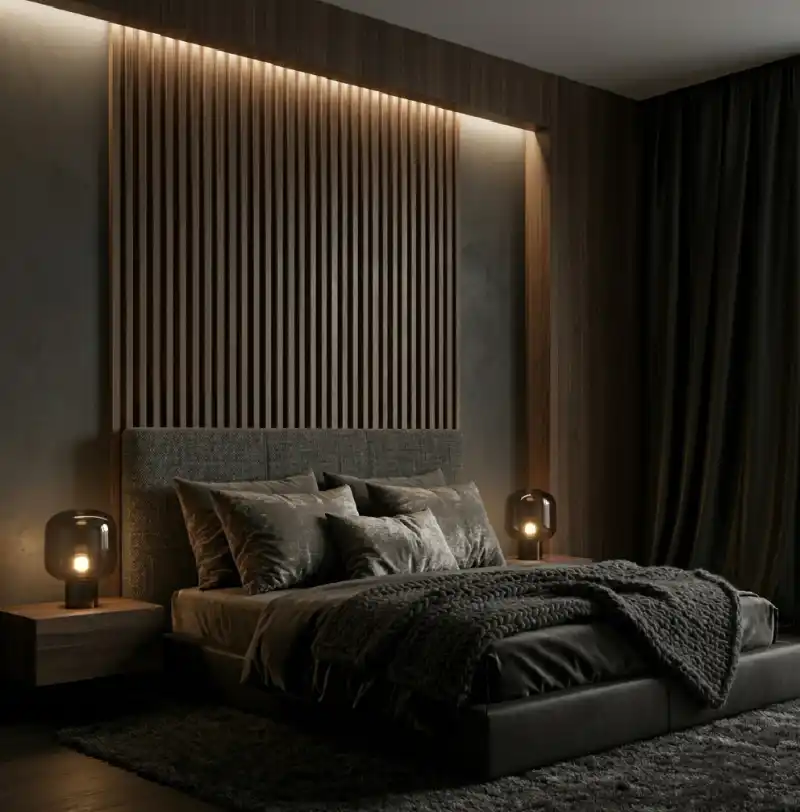 . Dark Moody Bedroom Idea: Fluted Timber Accents and Obsidian Silk Palettes