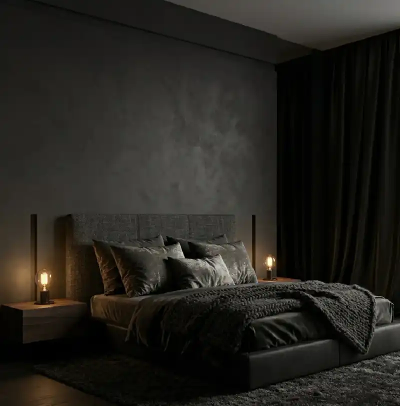 Dark Moody Bedroom Idea: Shadow-Gap Plasterwork and Textured Textile Layering
