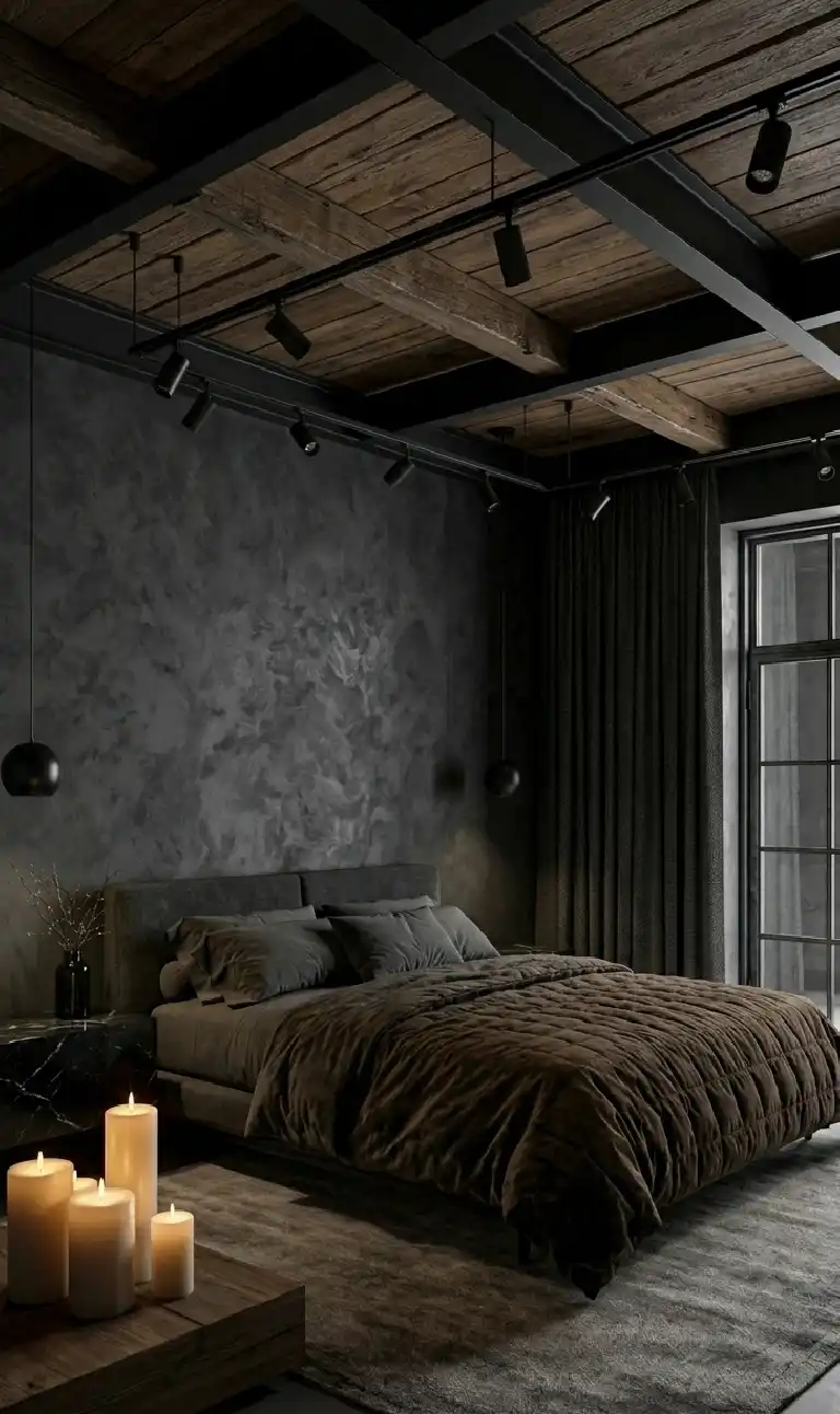 Dark Moody Bedroom: Industrial Steel Framing & Reclaimed Timber Joists